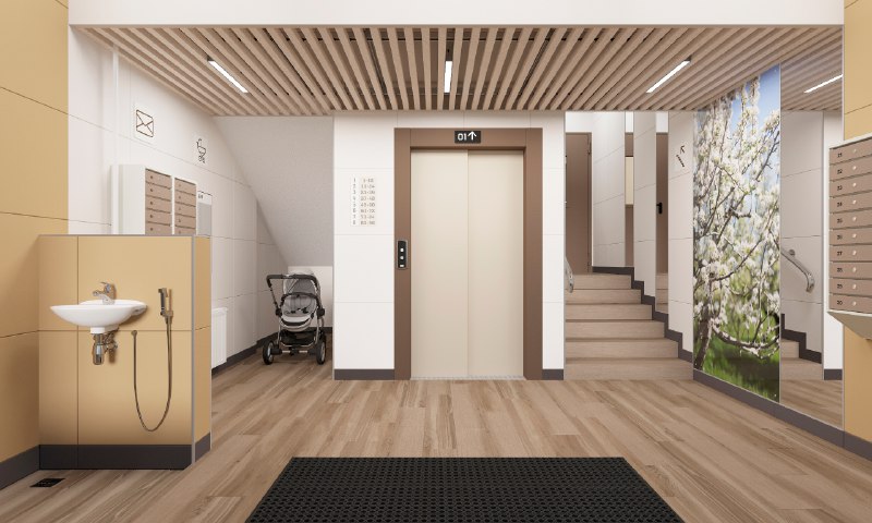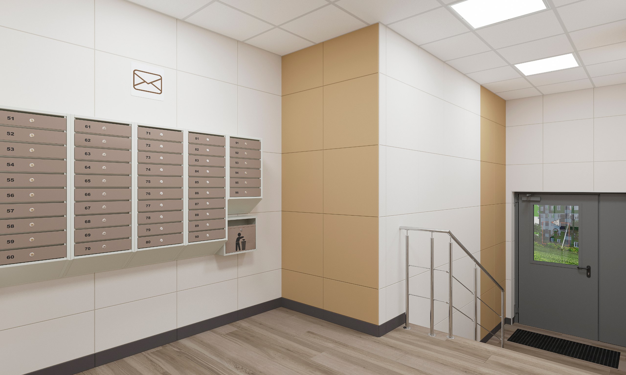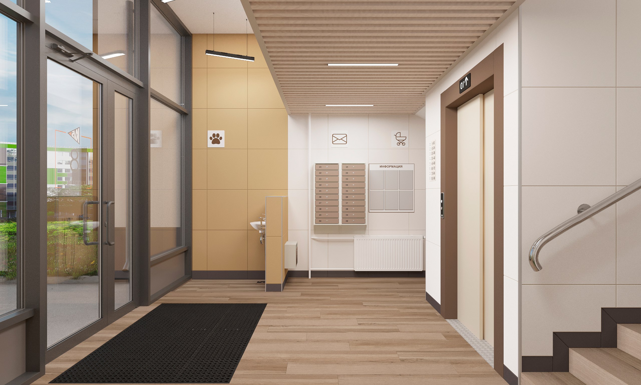 Входная группа жилого комплекса во Всеволожском районе Санкт-Петербурга с яркими акцентами.
